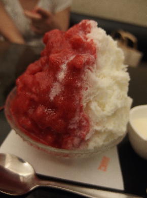 ほおずき市の混雑を避け、友達とかき氷を食べに店へと向かう。友達は抹茶、自分はイチゴをオーダー。あぁ~何という幸せ!今年初めて食べるかき氷~♪此処は氷屋さんがやってるので氷が本当に美味しい。ソースも生のイチゴを潰した物だし練乳も好みで後入れ出来る。量も丁度良い上品なかき氷なのである。頭にツーンとくる氷じゃなくてフワフワの口の中ですーっと溶ける纏(まとい)の氷、皆様にも食べて頂きたいわぁ。