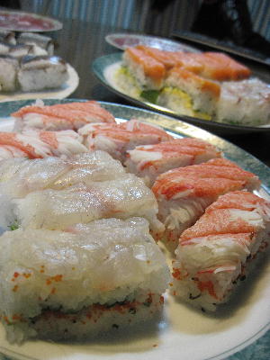「我が家から行事が消えた」と娘に言われ、おーっ!そうだそうだそうだった、今日は楽しい「雛祭り」と気付く。何にも無いのはやっぱり女子として悲しいもんね。せめて蛤の澄まし汁でも…という訳で急遽スーパーへ走り込む。この日ばかりは鮮魚コーナーも手巻きセットやら刺身盛り合わせやら蛤やら賑わいを見せる。さっさと材料を買って4種の押し寿司を作る。鯛は昆布締めして鯵は酢で〆て卵はおぼろにして…。気持ち頑張って母親らしい事をしてみる。駆け込み努力の甲斐あって娘も「わ~凄いね!美味しそう。綺麗だね♪」と喜んでくれた。あ~やっぱり季節の行事って良いよね!お雛様は出しそびれちゃったけど…許してくれたしまぁいっか~。